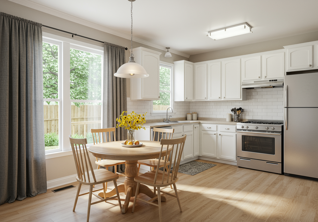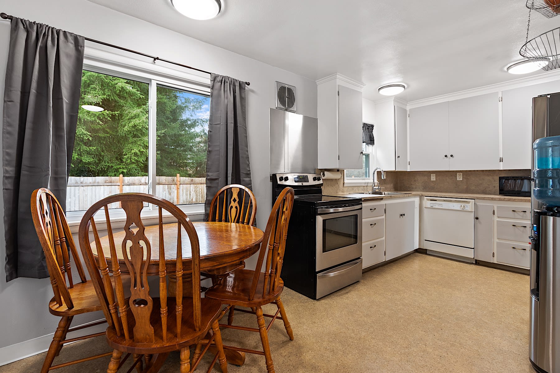 Said kitchen has a practical corner-cabinet layout that makes the most of the allotted square footage. All the amenities, a dining space, laundry, and a storage closet tucked in along the chimney means you have all the room necessary. Additionally, your access to the covered walkway to the detached garage lies at the far end.