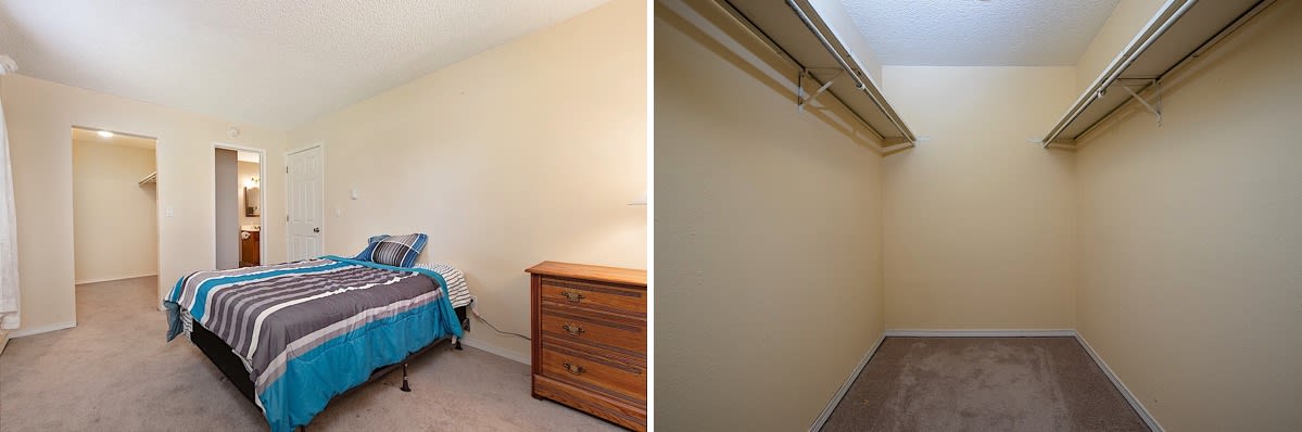 Venture down the hallway past the secondary bedroom and main bathroom to the primary bedroom, which clearly received the greater share of space allotment priority in this unit’s design. It’s comfortably spacious, and its direct access to the bathroom is rare among condominiums of its size. Most unique, however, is a roomy walk-in closet with enough room for you and your other half.