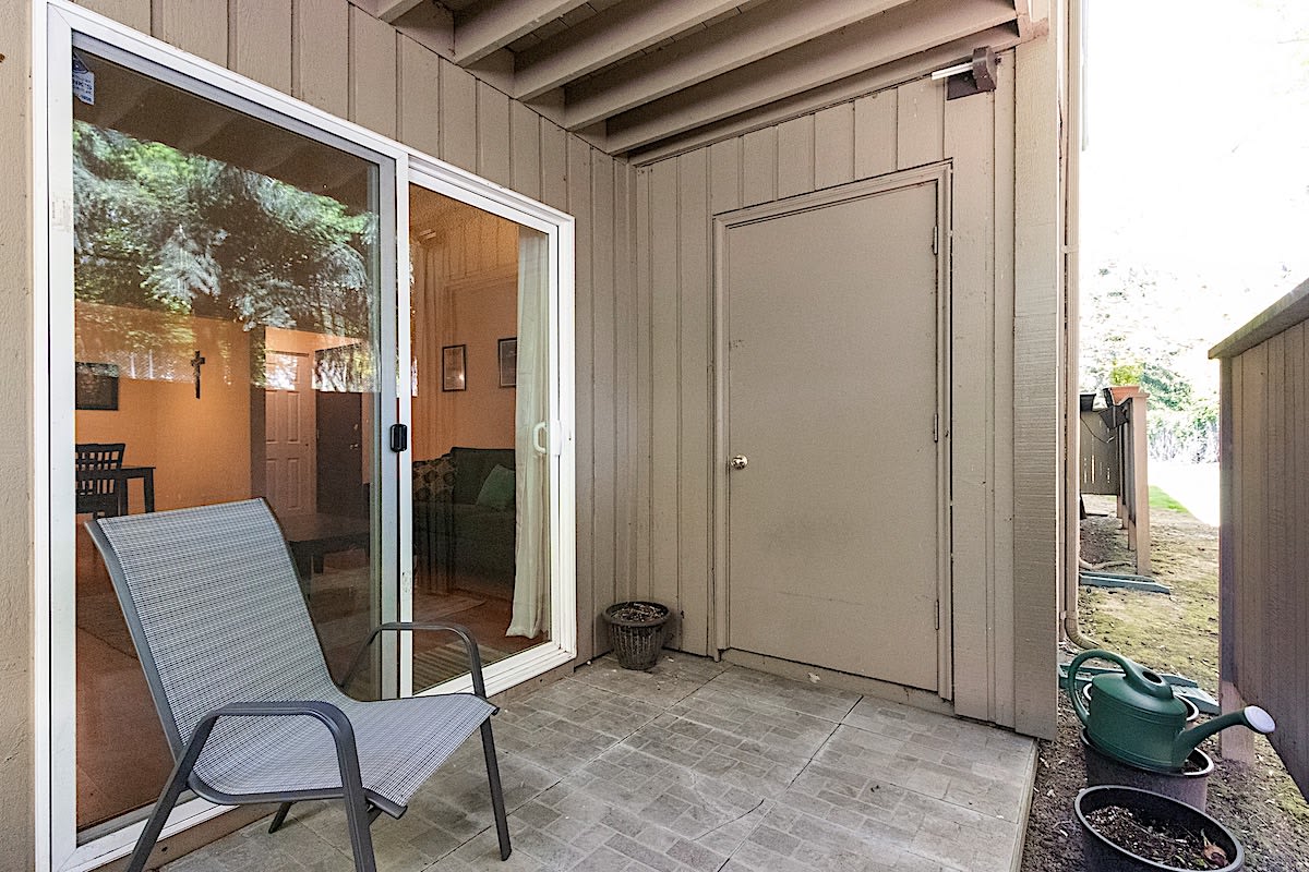 Through the living room, step back outside to the covered patio area with an attached storage shed. As we mentioned, many condominiums forgo privacy for convenience, but that is far from the case here. Through the back, you’ll notice no straight-on shared sightlines with another unit, favoring instead a view of the trees that make up the border of the property. Also, you’ll find few to no lateral sightlines to the neighboring units. This remains true for all of the windows in the unit, meaning you’ll never be staring into someone’s living room.