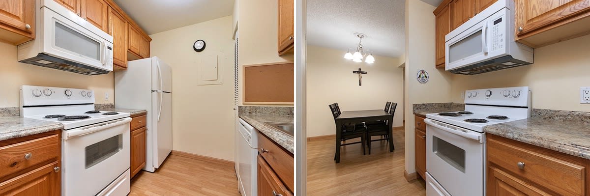 The kitchen makes effective use of its small space, opting for a two-sided design style that hugs the walls. Featuring a surprisingly great total storage/cabinetry footprint, coil-style stove/oven, built in microwave, electrical panel, and a bifold door housing the water heater, this kitchen certainly makes the most of its allotment of square footage.