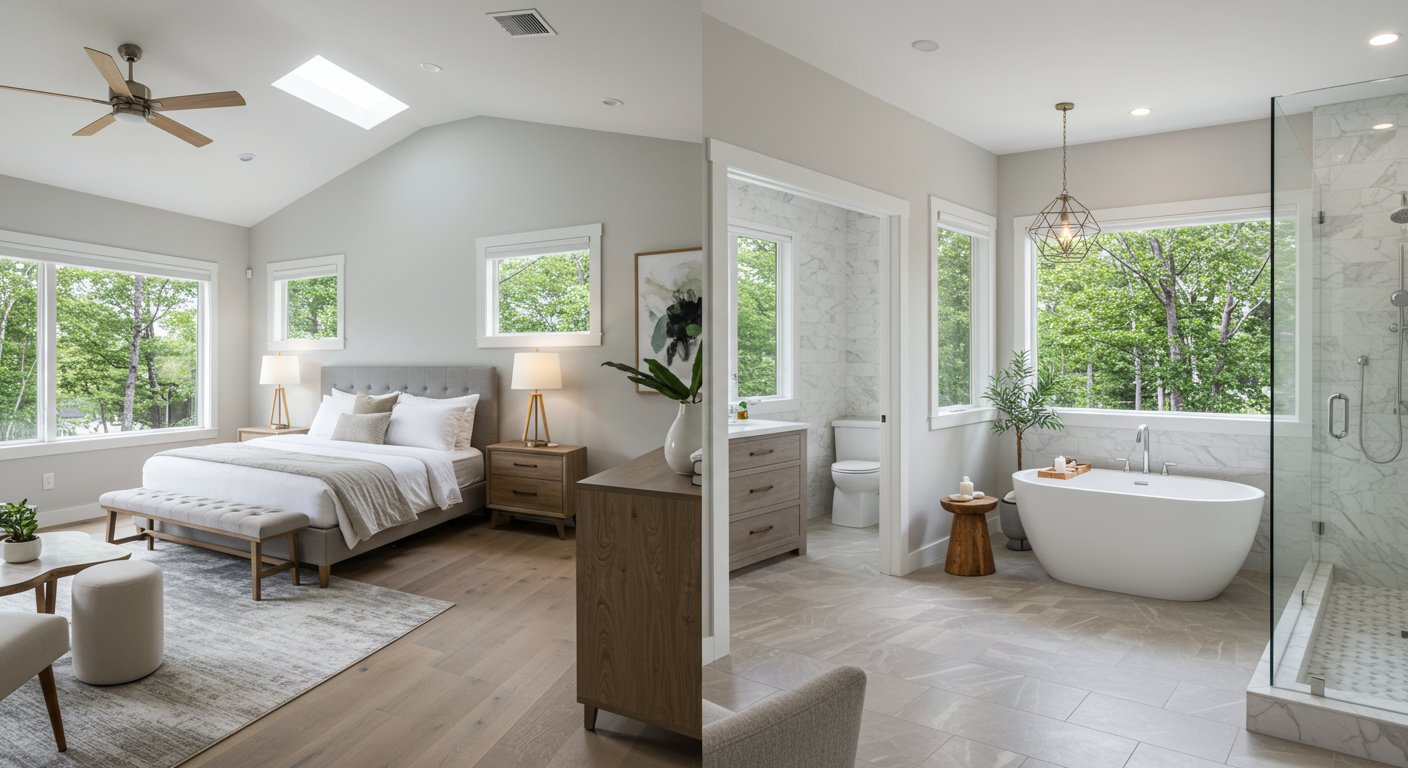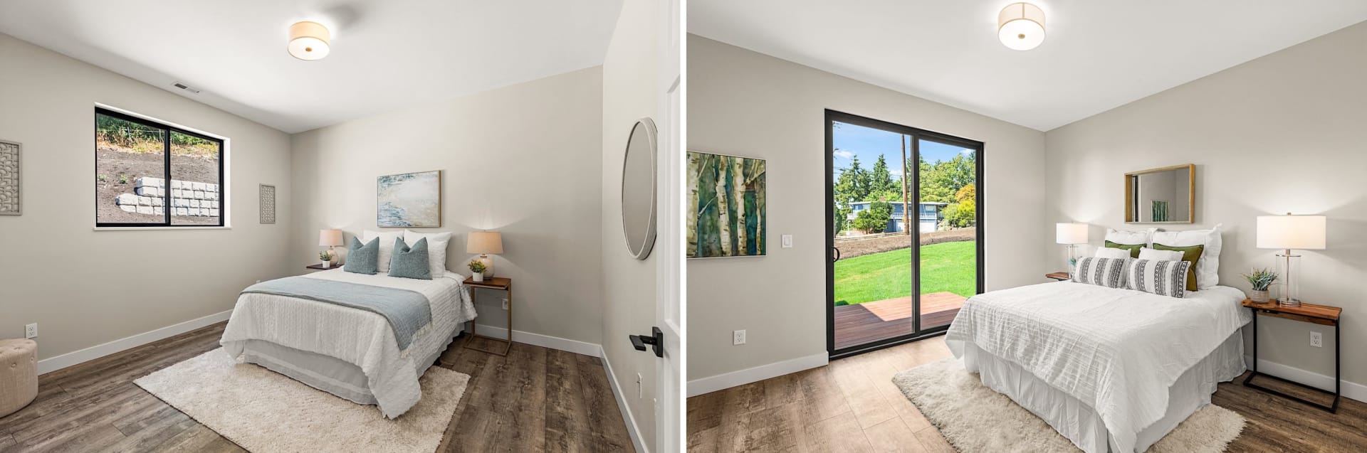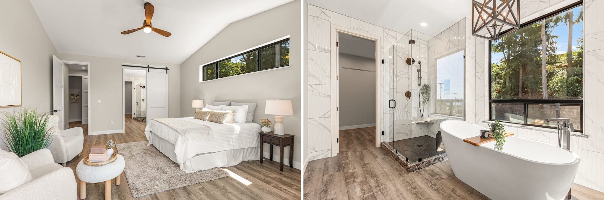 Consistency is the key to a successful home design, and in tune, 7702 6th brings it from end to end. A primary suite befitting royalty benefits from near-panoramic lighting, tall ceilings, and the same accents characteristic of the main living space. Behind the suite’s charming barn door is a bathroom/walk-in closet combo with further luxurious touches. Note the modern lantern style hanging fixture, Edison-bulb rustic sconces above the vanity, and textured tile walls, all of which amount to a bold and successful design choice. A standalone bathtub and large corner shower only serve to capstone this delightful space. It should, then, come as no surprise with this level of care that the home’s additional two bedrooms, spacious in their own right, carry the care in design the rest of the home exhibits.