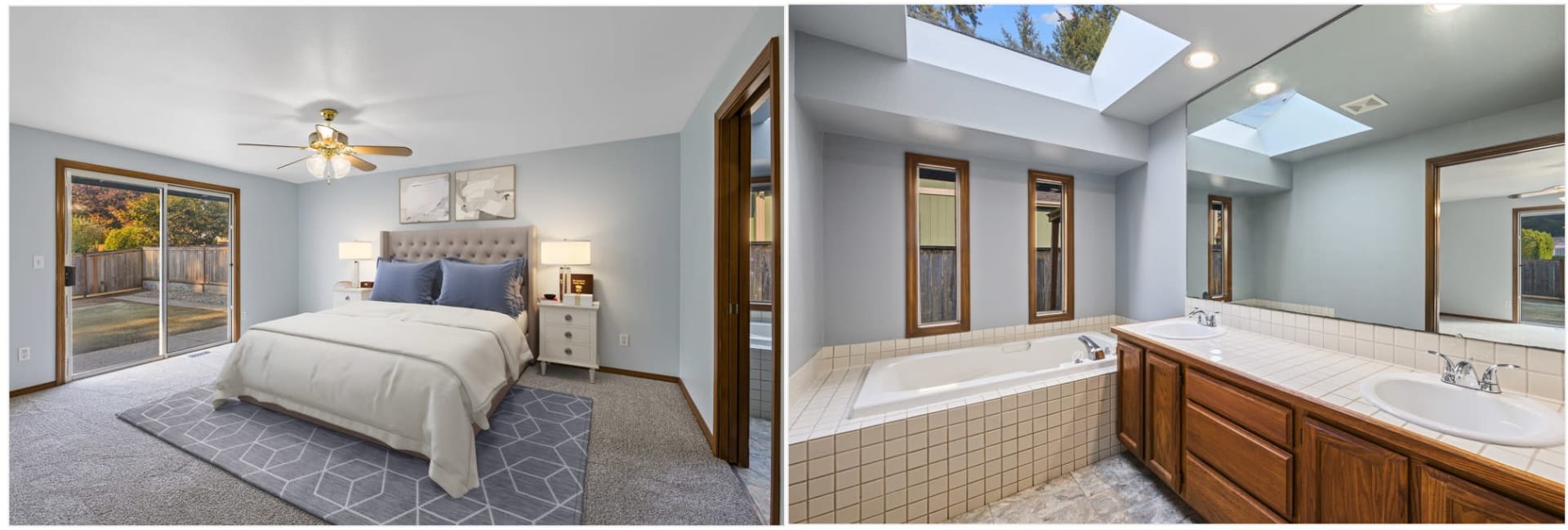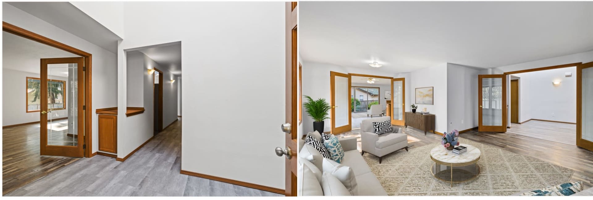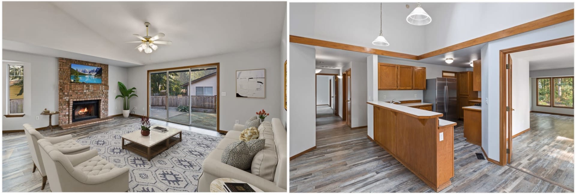 We begin in the entryway, a thoroughfare to the 1,930 square foot home. Bathed in sunlight, you’ll be greeted by a soaring sloped ceiling and skylight that illuminates both a hallway to the center of the home and a double-door leading into a cozy den. These wide doorways accentuate the spaciousness of this wing of the home, a formidable gathering space with near-immediate and convenient kitchen access. Digital staging demonstrates the decorative possibilities available to you with the present paint scheme