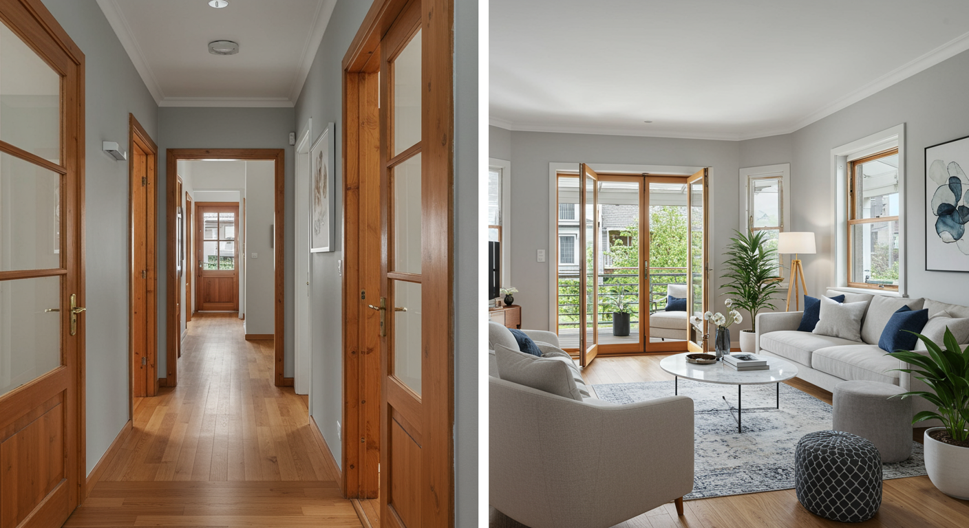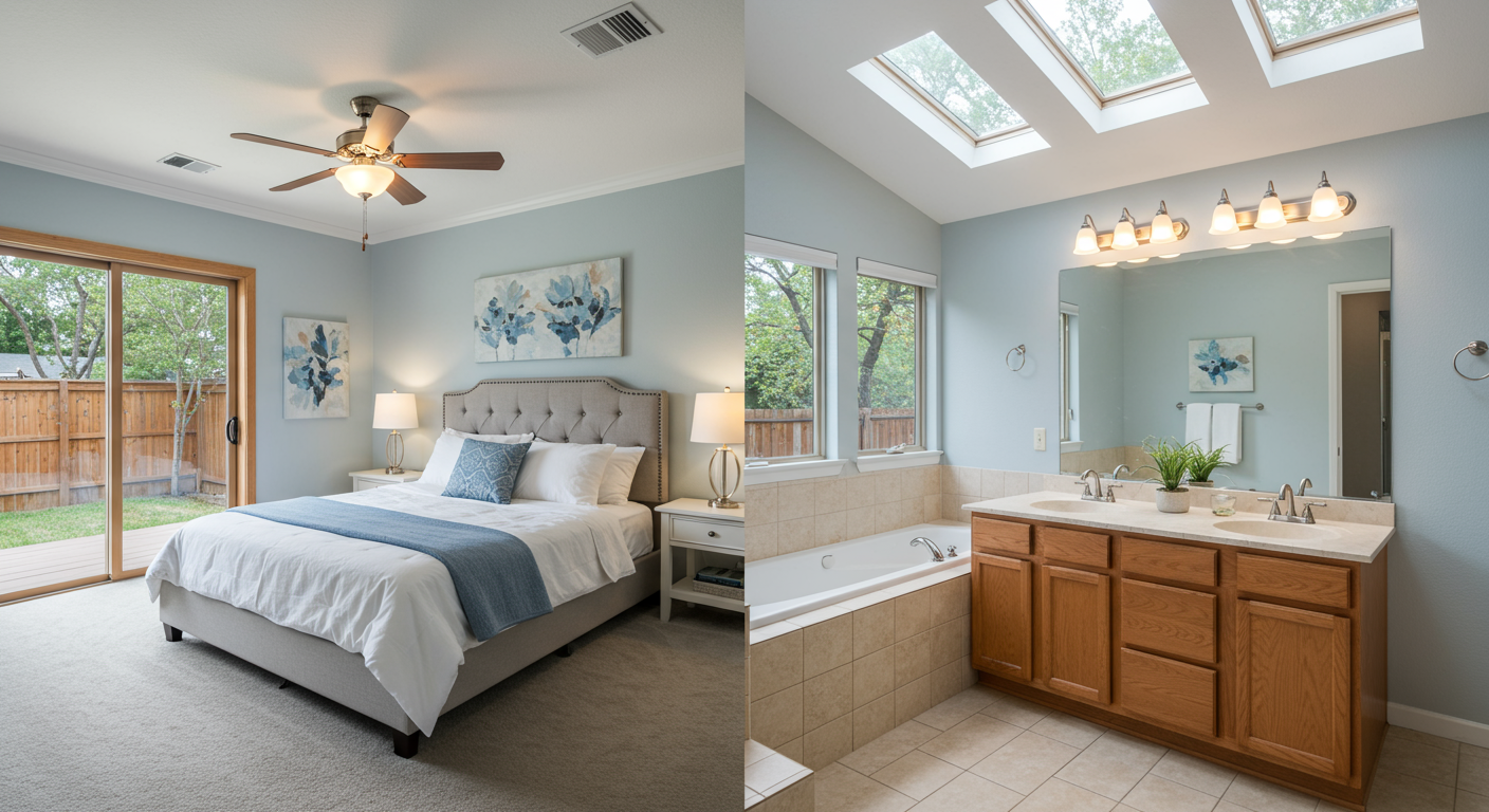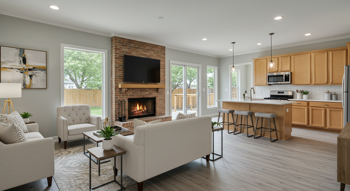 We begin in the entryway, a thoroughfare to the 1,930 square foot home. Bathed in sunlight, you’ll be greeted by a soaring sloped ceiling and skylight that illuminates both a hallway to the center of the home and a double-door leading into a cozy den. These wide doorways accentuate the spaciousness of this wing of the home, a formidable gathering space with near-immediate and convenient kitchen access. Digital staging demonstrates the decorative possibilities available to you with the present paint scheme