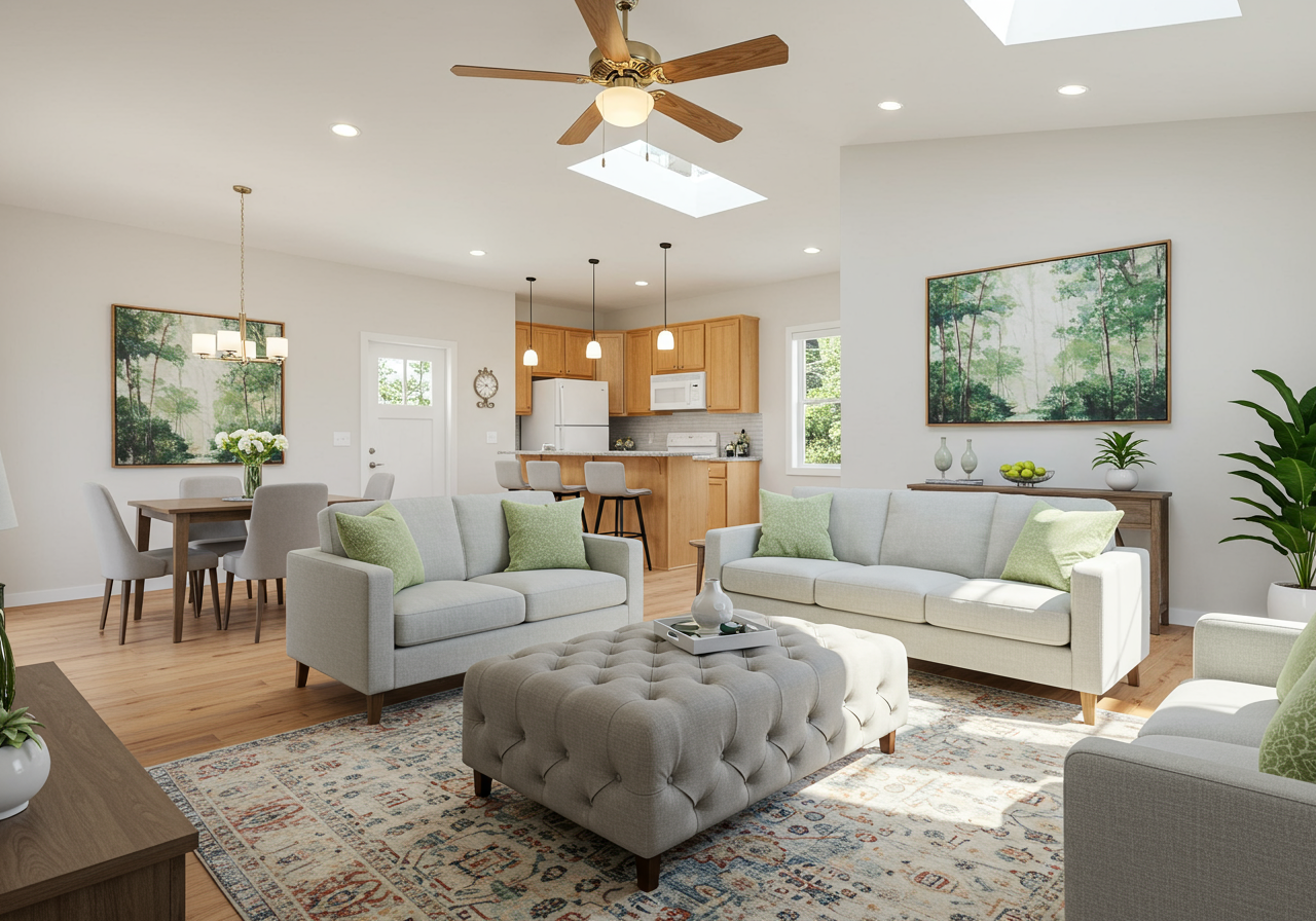 Through the dining room door, you’ll encounter the primary living space. We can say without fear of contradiction that the impression left by this room is a particularly grand one. Vaulted ceilings, more skylights, and an entertainer’s kitchen further make use of those aforementioned sightlines that give this home a certain elbow-room spaciousness many other homes fail to deliver. You’ll have no trouble spending quality time with your loved ones here, as every square foot is within sight, and within earshot.
